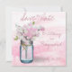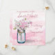 Jarro de mason azul-safra amarrado com um fio de juta e um buquê de flores de ervilha doce em tons pastéis de creme e rosa colocados em frente a um derrame de aquarela rosa pintado de fundo. © 2015 Cores d'água originais por WhimsicalArtwork™ Perfect para o casamento ou a festa de vintage daquele país.