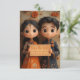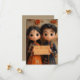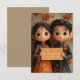 A ilustração animada 3D do estilo anime de um menino e menina indianos em traje tradicional com olhos grandes e cabelos pretos. A menina está vestindo um vestido laranja, e há flores coloridas na parede atrás delas.