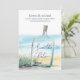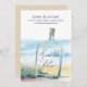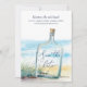 Uniquely styled wedding save the date card features a watercolor beach scene with a "message in a bottle" bearing the words "save the date" in chic handwritten script typography. Personalize with your names and your beach or summer wedding details at the top, including date, location, and wedding website.