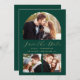 Este simples e minimalista Cartão Salvar a Data apresenta um arco de fotos personalizado acima das palavras "Salvar a Data" em um elegante roteiro de manuscrito dourado, seguido pelos nomes do casal, data do casamento e cidade em sans serif em um fundo verde esmeralda. Duas fotos quadradas menores aparecem na parte inferior do cartão. Adicione uma mensagem mais detalhada com informações adicionais no verso.