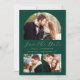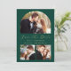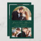 Este simples e minimalista Cartão Salvar a Data apresenta um arco de fotos personalizado acima das palavras "Salvar a Data" em um elegante roteiro de manuscrito dourado, seguido pelos nomes do casal, data do casamento e cidade em sans serif em um fundo verde esmeralda. Duas fotos quadradas menores aparecem na parte inferior do cartão. Adicione uma quarta foto horizontal e uma mensagem mais detalhada com informações adicionais no verso.