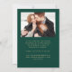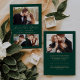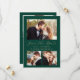 Este simples e minimalista Cartão Salvar a Data contém uma foto horizontal acima das palavras "Salvar a Data" em um elegante roteiro de escrita manual dourada, seguido pelos nomes do casal, data do casamento e cidade em sans serif em um fundo verde esmeralda. Duas fotos quadradas menores aparecem na parte inferior do cartão. Adicione uma quarta foto horizontal e uma mensagem mais detalhada com informações adicionais no verso.
