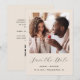 Este simples e minimalista Cartão Salvar a Data contém uma foto quadrada acima das palavras "Salvar a Data" no elegante guião preto, seguido pelos nomes dos casais, data do casamento e cidade em sans serif em um fundo bege. Adicione uma mensagem mais detalhada com informações adicionais no verso, juntamente com um código QR que envia convidados para o seu site de casamento.