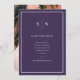 Os elegantes cartões modernos de save the date de casamento apresentam um design de texto minimalista simples e colorido de roxo escuro e branco, com uma moldura clássica na borda. Adicione suas iniciais ou monograma para torná-los completamente seus e adicione sua foto pessoal favorita no verso.