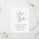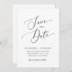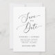 Moderno e mínimo, salve o cartão de data com um roteiro elegante que diz "salve a data" no meio com as breves informações do casamento. Você pode adicionar uma foto atrás.
