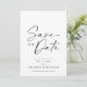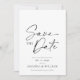 Anuncie seu dia especial com este Minimalista Preto e Branco Salve o Cartão de Data. Apresentando um roteiro preto elegante em uma frente branca nítida, este design é moderno e eterno. As costas exibem uma sombra macia-lilática, acrescentando um toque romântico sutil. Perfeito para casamentos, noivados e chás de panela, este cartão de na moda garante que seus convidados marquem seus calendários para comemoração inesquecível.