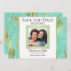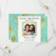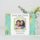Um cartão com fotos de casamento contemporâneo "Salve a Data" com um fundo de mármore de folha de ouro de menta e falsa para anunciar seus planos de casamento em estilo. Carregue a foto escolhida no lugar da foto de amostra mostrada no modelo de design. Edite o texto de exemplo com suas especificações.