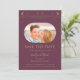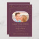 Mística Plum Dourado Sol Lua Solar Estrelas Espaço Salve As Datas apresentam um sol dourado, lua e estrelas armadas sobre um fundo de ameixa. Dentro é a sua foto favorita e o seu personalizado salva as informações de data. Personalize editando o texto nas caixas de texto. Projetado para você por ©Evco Studio www.zazzle.com/store/evcostudio