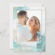 This modern abstract beach wedding photo save the date card features trendy modern fonts with stylish script calligraphy, framed by teal and gold alcohol ink splashes.