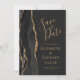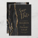 A borda esquerda deste elegante casamento moderno salve o cartão de data apresenta uma borda de agata preta aparada com falso brilho dourado. O texto personalizável combina manuscrito dourado, fontes em copperplate e itálico em um fundo off-blac. O verso apresenta um design de agate preto e dourado correspondente.