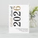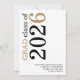 Modern Black Gold Text 2026 White Graduation. Available digitally and printed. A contemporary typographical design with stylish large typography rotated and to the left hand side at the top in black and gold. Easily personalise the rest of the text.