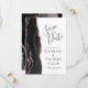 A borda esquerda deste elegante casamento moderno salve o cartão de data apresenta uma borda de agata preta, aparada com uma falsa rosa dourada. O texto personalizável combina a escrita manual de cinzas de carvão, as fontes em copperplate e itálico em um fundo branco. O verso apresenta um design de agate preto e rosa dourado correspondente.