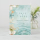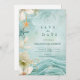 This modern wedding design features flowing watercolor waves in tranquil aqua and teal tones, paired with soft white florals, subtle seashell accents, and delicate gold details. The airy composition creates movement and depth while keeping the overall look refined, romantic, and contemporary.