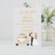 This elegant save-the-date wedding invitation features a timeless design centered around a beautifully illustrated antique wedding car, evoking a sense of vintage romance and charm. Beside it, a bride and groom share a tender kiss, capturing the joy and intimacy of the special moment. The text is presented in a rich marigold hue, adding warmth and sophistication while standing out gracefully against the background. Thoughtfully designed to be fully customisable, every detail—from names and dates—can be tailored to reflect your unique celebration.