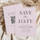 Announce your upcoming nuptials in style with our elegant, modern QR code save the date card. The non-photo save the date features "Save the Date" in black serif and script fonts with a lavender purple background. Personalize the front of the save the date card by adding your names, wedding date, wedding location, and other wedding details. The minimal save the date card reverses to feature your custom QR code with wedding website and custom text. Perfect save the date for both modern formal and casual weddings!