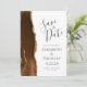 A borda esquerda deste elegante casamento moderno salve o cartão de data apresenta uma mocha marrom aqueteira agate borda com falsa brilho dourado. O texto personalizável combina a escrita manual de cinzas de carvão, as fontes em copperplate e itálico em um fundo branco. O verso apresenta um design de agate marrom e dourado.