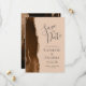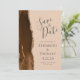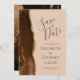 A borda esquerda deste elegante casamento moderno salve o cartão de data apresenta uma mocha marrom aqueteira agate borda com falsa brilho dourado. O texto personalizável combina a escrita manual de cinzas de carvão, as fontes em copperplate e itálico em um fundo bronzeado. O verso apresenta um design de agate marrom e dourado.