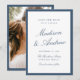 Announce your wedding with this navy photo save the date card, featuring a tailored border and a polished, formal layout. The couple’s names are showcased in elegant calligraphy script, while the wedding date, venue, and location are presented in classic serif type for a refined, balanced look. The back displays your engagement photo framed with a coordinating navy border, creating a cohesive two-sided design. Ideal for formal weddings, black tie ceremonies, classic venues, and traditional weddings, this personalized navy save the date coordinates beautifully with timeless wedding invitation suites and offers a sophisticated way to share your wedding date.