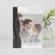 A borda esquerda deste elegante casamento moderno salve o cartão de data apresenta uma borda de agata preta, aparada com uma falsa rosa dourada. A sobreposição de texto personalizável combina o script de escrita manual em preto e as fontes de impressão em um fundo de fotos personalizado. A parte traseira apresenta um design agate correspondente.