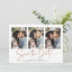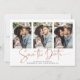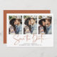 Moderno manuscrito Salve a data Cartão com fotos múltiplo em terracota ferrugem e branco em uma fonte elegante e que evoca um toque romântico manuscrito. Projetado para usar três de suas fotos favoritas para personalização adicional. Adicione facilmente seus nomes e datas para um design verdadeiramente personalizado. Entre em contato conosco em cedarandstring@gmail.com se precisar de assistência com o design ou produtos correspondentes.