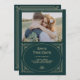 Convites de casamento glamorosos que apresentam uma interpretação moderna do clássico art déco. Uma moldura geométrica ornamentada e falsa dourada champanhe e ornamentação decoram um fundo verde esmeralda elegante com a sua foto pessoal favorita para um visual de casamento dramático e vintage.