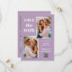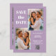 Esses cartões modernos e elegantes de save the date de casamento em lavanda apresentam três fotos do casal, além de texto branco em negrito em um fundo roxo claro. Adicione seu código QR para o site do seu casamento ou para que os convidados respondam online.