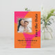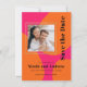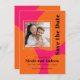 Este casamento ousado e bonito, salvo o cartão de data está aparecendo com o moderno estilo retrô! Planeje sua fabulosa celebração do dia de casamento com este vibrante esquema de cores de rosa quente e laranja. Esta placa colorida tem uma aparência de designer com formas laranja brilhantes arredondadas sobre um fundo rosa quente. O modelo de texto no tipo de nódoa contemporânea encara com uma vibração retrorreflectora e carregar o tema com beleza. Carregue sua foto quadrada no lugar da foto de exemplo mostrada para salvar personalizado o cartão de data que você terá orgulho de compartilhar com amigos e familiares.