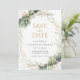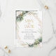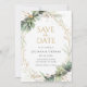 Eleve a papelaria do seu casamento com o Cartão de Save the Date da Moldura Dourada com Elegante Eucalipto. A frente do cartão exibe um design botânico elegante com folhas de eucalipto em greenery em aquarela, acentuadas com brilhos dourados cintilantes e uma moldura dourada. O verso é personalizável, permitindo que você adicione uma das suas fotos de casamento favoritas e seus nomes. Perfeito para anunciar o seu dia especial e garantir que seus convidados salvem a data.
