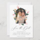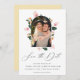 Quadro de arco moderno, salve o cartão com fotos de data. O quadro é adornado com folhagem de aquarela tropical, flores e fruta de citros de laranja. Elegante "Salve a data", gráfico de caligrafia e coordena o suporte a cores amarelo suave.
