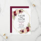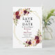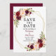 Cartão de Anúncio de Casamento Save The Date Floral Burgundy Aquarela Elegante inclui rosas burgundy, rosas rosa, rosas vermelhas e folhagens em uma moldura geométrica dourada.
