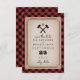 Um casamento elegante e rústico salva o convite de data com um fundo de xadrez de búfalo e um design de machado monograma.