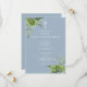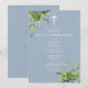 Este convite elegante de data de primeira comunhão em azul poeira com verde eucalipto botânico pode ser personalizado com suas informações em tipografia elegante com iniciais de monograma no verso. Criado por Thisisnotme©