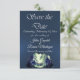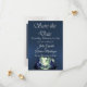 Montanhas Aquarela O Save the Date apresenta majestosas montanhas em aquarela em tons de azul e verde sobre um fundo de cetim azul com espaços reservados para as informações. Há um espaço para uma foto do casal no verso do cartão. Para alterar os detalhes, clique em «Personalizar». Para mover o texto ou alterar o tamanho, a fonte ou a cor do texto, clique em «Clique para personalizar ainda mais»