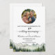 Um elegante Aniversário de Casamento Salve o Cartão de Data com montanhas de aquarela e pinheiros e uma foto especial que você pode personalizar com seus detalhes.