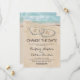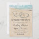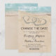 Casamento no destino do oceano, cartão de mudança de data com uma ilha tropical ao fundo, uma praia arenosa vintage com dois corações na costa, suas iniciais e um modelo de texto editável.