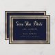 Marinho de luxo azul e na moda de ouro elegante Casamento Salve o convite de Data. Esses simples convites geométricos de marinho azul e ouro são perfeitos para qualquer evento ou ocasião clássico e sofisticado. Este design refinado e deslumbrante é perfeito para o indivíduo ou casal da moda e na moda. Personalize este design com sua própria mensagem e informações personalizadas. Todas as designs são impressas.
