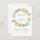 Lindo narciso amarelo e branco e coroa floral feita em aquarelas suaves são perfeitas para este “Save the Date” de casamento da primavera e verão. Rótulo e tipografia verde coordenada. Personalize conforme necessário. Para personalizar, clique no link "personalizar ainda mais" e use a ferramenta de design para fazer alterações. Muitas seleções de papel diferentes, bem como formas de papel. 100% de satisfação do cliente na “Zazzle”