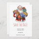Salve o cartão de data com uma bela imagem de Natal. Um Papai Noel tradicional em sua roupa vermelha clássica. Seu cheio de presentes. Pronto para trazer presentes para todos.