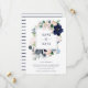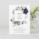 Este convite de save the date de casamento elegante apresenta uma moldura de flores em aquarela azul-marinho, azul claro e rosa velho com folhas verdes e bege neutro. O verso do cartão apresenta listras azuis náuticas e brancas.