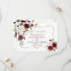 Desenho de cartão elegante com flores de água borgoña e folhas verdes, uma moldura dourada falsa, divisor floral, em um fundo branco. No verso, os mesmos buquês de flores. Use a ferramenta Personalizar para adicionar suas informações, alterar as fontes, cores das fontes. Para itens correspondentes, visite minha Coleção de Flores Borgoña Beige.
