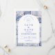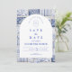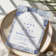 Um design atemporal em azul e branco inspirado no clássico porcelana Delft e padrões toile franceses. A borda de azulejos em patchwork combina flores delicadas, listras e motivos ornamentais que evocam cerâmicas europeias vintage. Um painel arqueado suave no centro mantém o layout refinado e elegante, permitindo que os detalhes do padrão inspirado em porcelana emoldurem a celebração de forma linda. Perfeito para casais que planejam um casamento sofisticado em azul e branco com charme europeu tradicional.