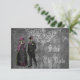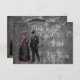 Convites de casamento "Save the Date" para o Halloween, legais e assustadores, com uma fantástica noiva e noivo esqueletos do terror gótico. A noiva está vestida com um lindo vestido de noiva vintage preto, rosa e verde com flores e ornamentos de borboletas. O noivo está elegante em seu chapéu de copa alta, fraque e bengala. O fundo é uma colagem elegante e gótica em preto, cinza e branco shabby chic com decorações ornamentais em branco, uma libélula, escrita antiga desbotada e um padrão de arlequim estiloso. No verso desses convites góticos funky há uma glamourosa base de pérolas pretas impressas e renda com texto para você personalizar com os detalhes do seu evento. Convites divertidos, sofisticados e na moda. Tenho produtos correspondentes na minha loja. Todo o texto pode ser facilmente personalizado para atender às suas necessidades e você pode alterar o estilo, a cor e o tamanho da fonte, se desejar. Se precisar de ajuda para personalizar seu produto, entre em contato comigo através da minha loja e ficarei feliz em ajudar. Base de pé