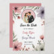 Esta elegante floral de aquarela salva o convite de data é perfeito para um casamento moderno. A design romântica apresenta uma elegante estrutura floral de aquarela com uma ilustração noiva e noiva e caligrafia preta sobre fundo branco.