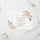 Desenho de cartão elegante com flores rosa blush aquarela e folhas verdes, uma moldura dourada falsa, divisor floral, em um fundo branco. No verso, buquê de flores rosa. Use a ferramenta Personalizar para adicionar suas informações, alterar fontes e cores das fontes. Para itens correspondentes, visite minha Coleção de Flores Creme Rosa.
