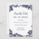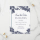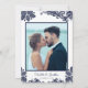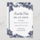 Este design apresenta um fundo branco nítido com um marinho azul nos cantos traseiros e frontais. Um lado do design apresenta um modelo moderno para adicionar facilmente fotos personalizadas do noivado, os nomes dos primeiros casais e a data do casamento futuro. No verso, personalize a design de casamento Salvar a data com seus nomes e detalhes personalizados em letras azuis elegantes e script.
