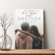 Um casamento simples e moderno salve a design de data com um cheio sangrando fotos verticais, com seus nomes no topo em letras modernas, juntados por um guião florescente "e". Personalize com sua data e local de casamento e adicione detalhes adicionais às costas, como seu site de casamento. Devido ao posicionamento dos elementos de texto e design, este estilo é recomendado para fotos verticais com amplo espaço em branco ou luz no topo,
