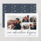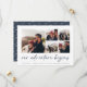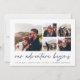 Um moderno e empolgante cartão de data para o casal de espírito aventura, este design simples e limpo apresenta cinco fotos quadradas em um layout de colagem em grade, com "nossa aventura começa" acima em um roteiro escrito à mão azul marinho. Personalize com seu anúncio, nomes e detalhes adicionais na parte inferior e adicione mais (como seu site de casamento) na parte de trás.