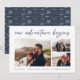 Um moderno e excitante cartão de data para o casal de espírito aventura, este design simples e limpo apresenta três fotos horizontais ou orientadas à paisagem em um layout de colagem em grade, com "nossa aventura começa" acima em um roteiro escrito à mão azul marinho. Personalize com seu anúncio, nomes e detalhes adicionais na parte inferior e adicione mais (como seu site de casamento) na parte de trás.