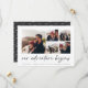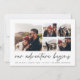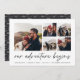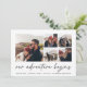 Um moderno e excitante cartão de data para o casal de espírito aventura, este design simples e limpo apresenta cinco fotos quadradas em um layout de grade, com "nossa aventura começa" acima em um script escrito à mão preto de cinza suave. Personalize com seu anúncio, nomes e detalhes adicionais na parte inferior e adicione mais (como seu site de casamento) na parte de trás.