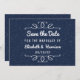 Estes cartões salve a data são perfeitos para qualquer casal planejando um casamento romântico moderno. O design apresenta estrelas simples e muito elegantes sobre um fundo azul marinho chic com uma letra branca tendenciosa. Este design pode ser personalizado para se adequar ao seu evento especial e será o anúncio perfeito para qualquer partido moderno e moderno, incluindo chás de panela, noivados, chás de casamento, festas de aniversário e muito, muito mais.